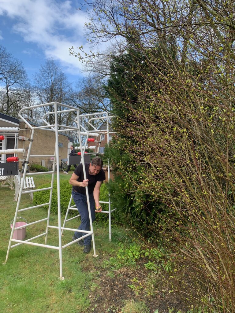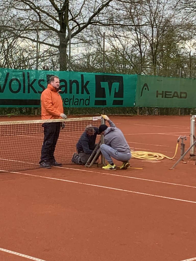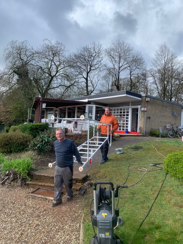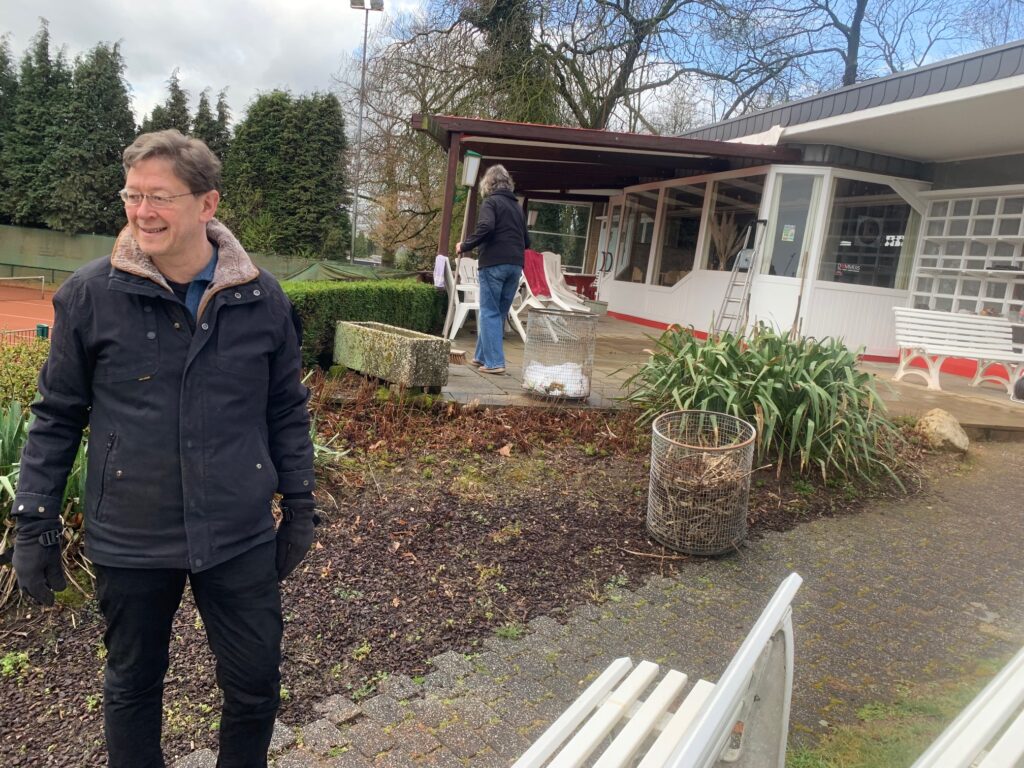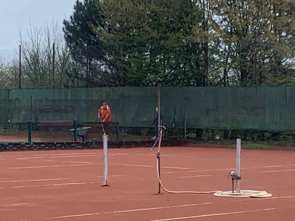Nachdem das Vereinshaus neu gestrichen wurde, ist nun die Überdachung auf der Terrasse vor dem Clubhaus dran. Die alten Planen waren verrottet und mussten entsorgt werden. Jetzt ist eine neue bestellt worden, welche im Mai angebracht wird. Die neue Überdachung ist durchgehend, so dass bei Regen zumindest von oben alles dicht ist. Zu diesem Zweck mussten Arbeiten bzw. Änderungen an der Unterkonstruktion aus Holz vorgenommen werden. Dies wurde von unserem neuen Mitglied Will Hoolmanns erledigt, der vom Fach ist. Anschließend haben Sven und Rolf der Holzkonstruktion zum Wetterschutz und Verschönerung eine neue Öl-Lasur aufgetragen. Nach getaner Arbeit waren beide recht zufrieden (siehe Foto).