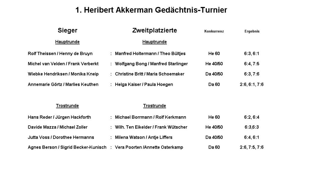 Die Vorbereitungen für das Heribert Akkerman Gedächtnis-Turnier sind angelaufen. Das seit 2014 jährlich stattfindende Tennis-Doppelturnier in Gedenken an den Sportfreund Heribert Akkerman findet somit auch in diesem Jahr seine Fortführung.